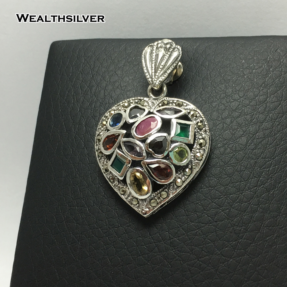 จี้หัวใจนพเก้าเงินแท้ ขนาดกลาง ประดับด้วยอัญมณีพลอยแท้